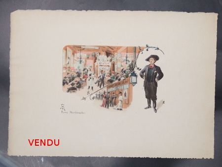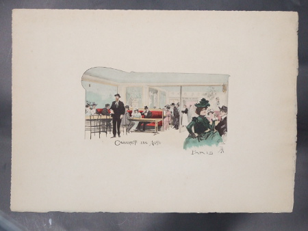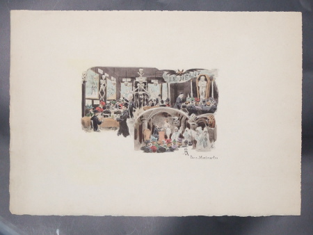 Cabaret bruyant - Paris-Montmartre watercolor lithograph c 1899 - drawing of 4x6 inches in the center of a 9x12 sheet