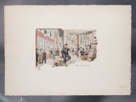 Aristide Bruant - Paris-Montmartre watercolor lithograph c 1899 - drawing of 4x6 inches in the center of a 9x12 sheet
