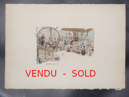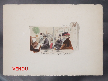 Cabaret des arts - Paris-Montmartre watercolor lithograph c 1899 - drawing of 4x6 inches in the center of a 9x12 sheet